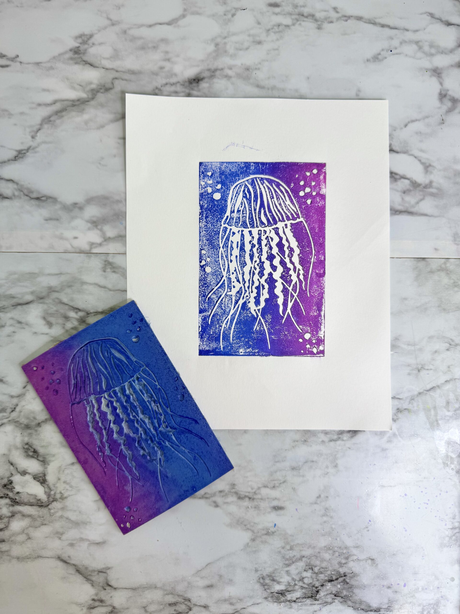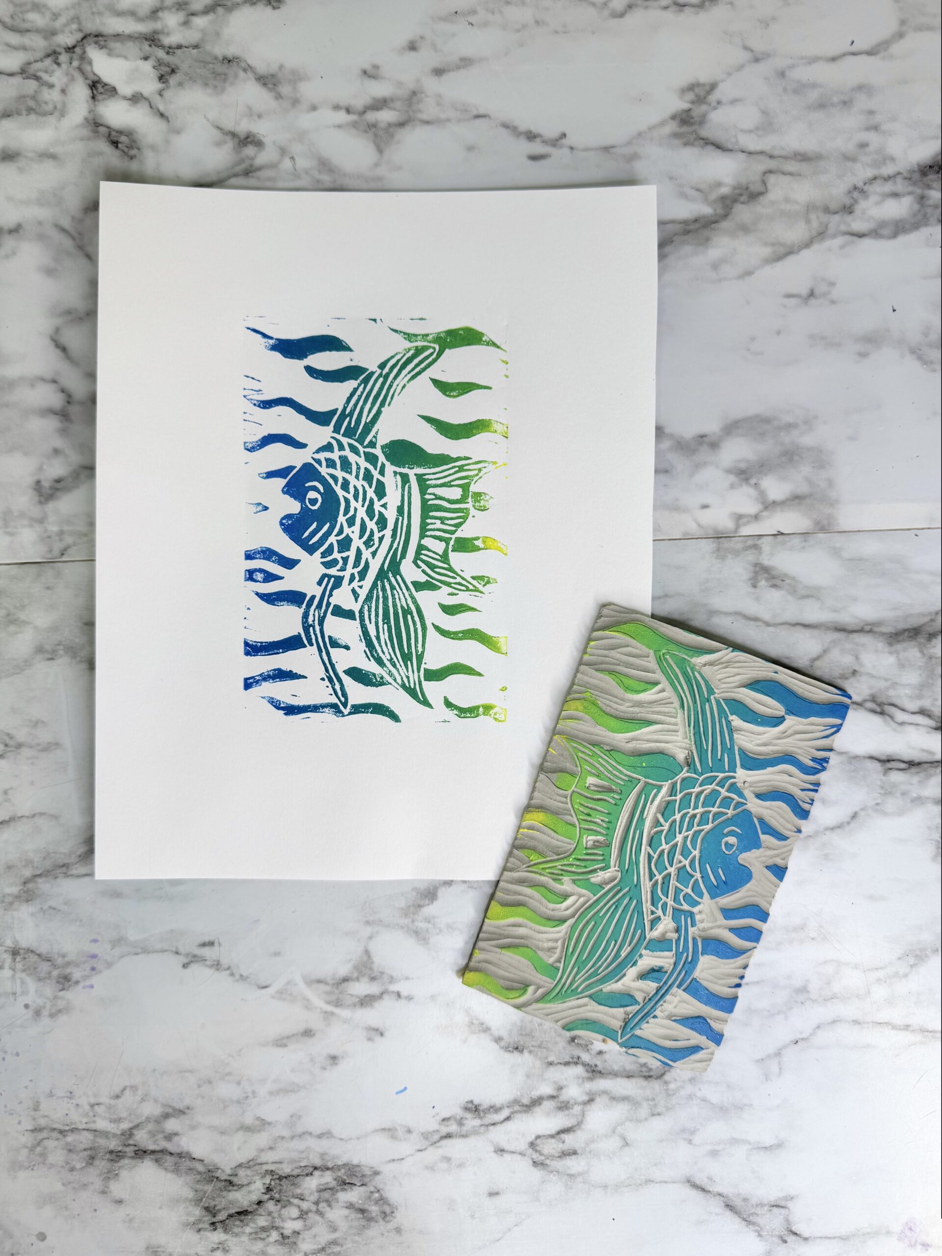 When the linoleum tile is finished students will set up a printmaking work station following the teacher’s setup demonstration. Students make practice on scrap paper printing their fish before they work on the final paper. The students will create 1-4 prints on their final paper of their fish linocut.