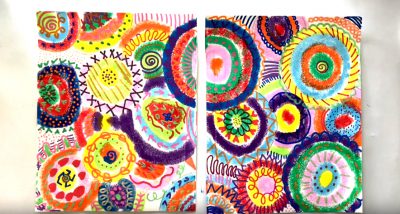 Students will collaborate in small groups to design a repetition of colorful circles. They will then separate the two pages and individually use shapes and lines to make designs on their artwork.