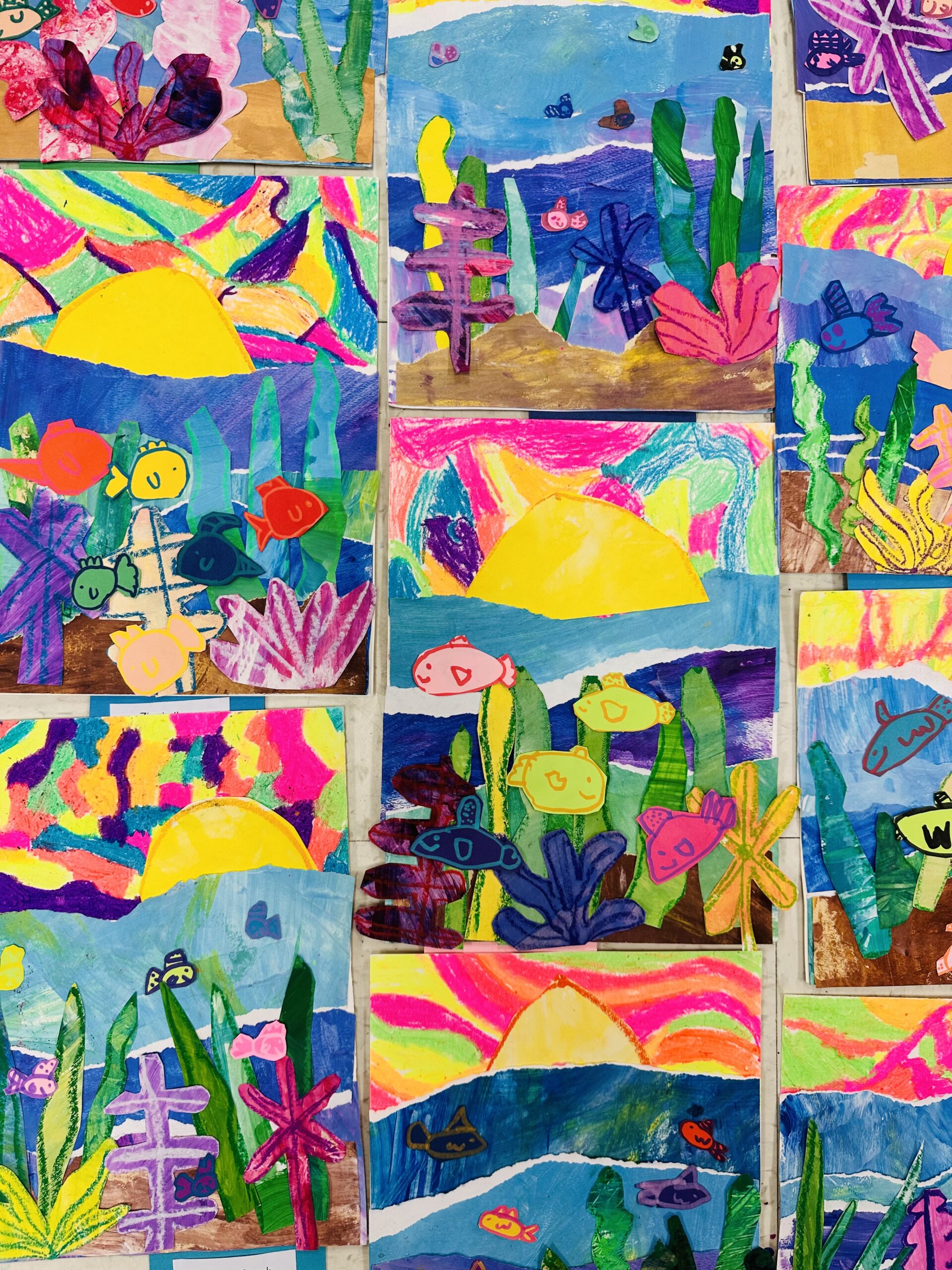 Students will cut 3×5 inch pieces of brightly painted paper to create coral and use oil pastels to draw coral and seaweed on contrasting colors. They will cut and glue everything onto the layered ocean background. |