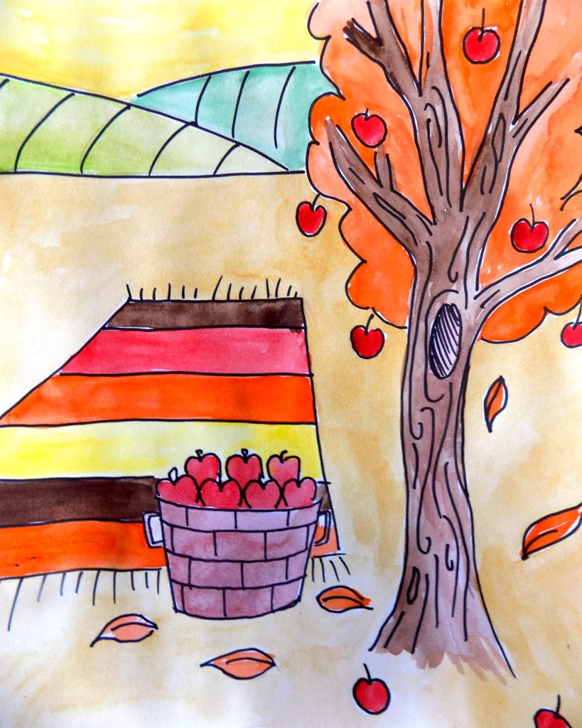 Use a pencil to draw the horizon line and the vanishing point at the top of the page. Then, demonstrate how to draw two orthogonal lines to the vanishing point. Finally, create an enclosed rectangle by drawing two parallel lines. Demonstrate how to draw a tree in the foreground, autumn details (such as an apple […]