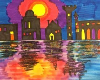 Draw a horizon line across your page. Place several rectangles along the top of the line. Fill the rectangles with shapes to represent windows and doors. Fill the buildings with a black Sharpie marker. Use washable markers to create the sky. When a color is used, it is repeated in the lower half of the […]