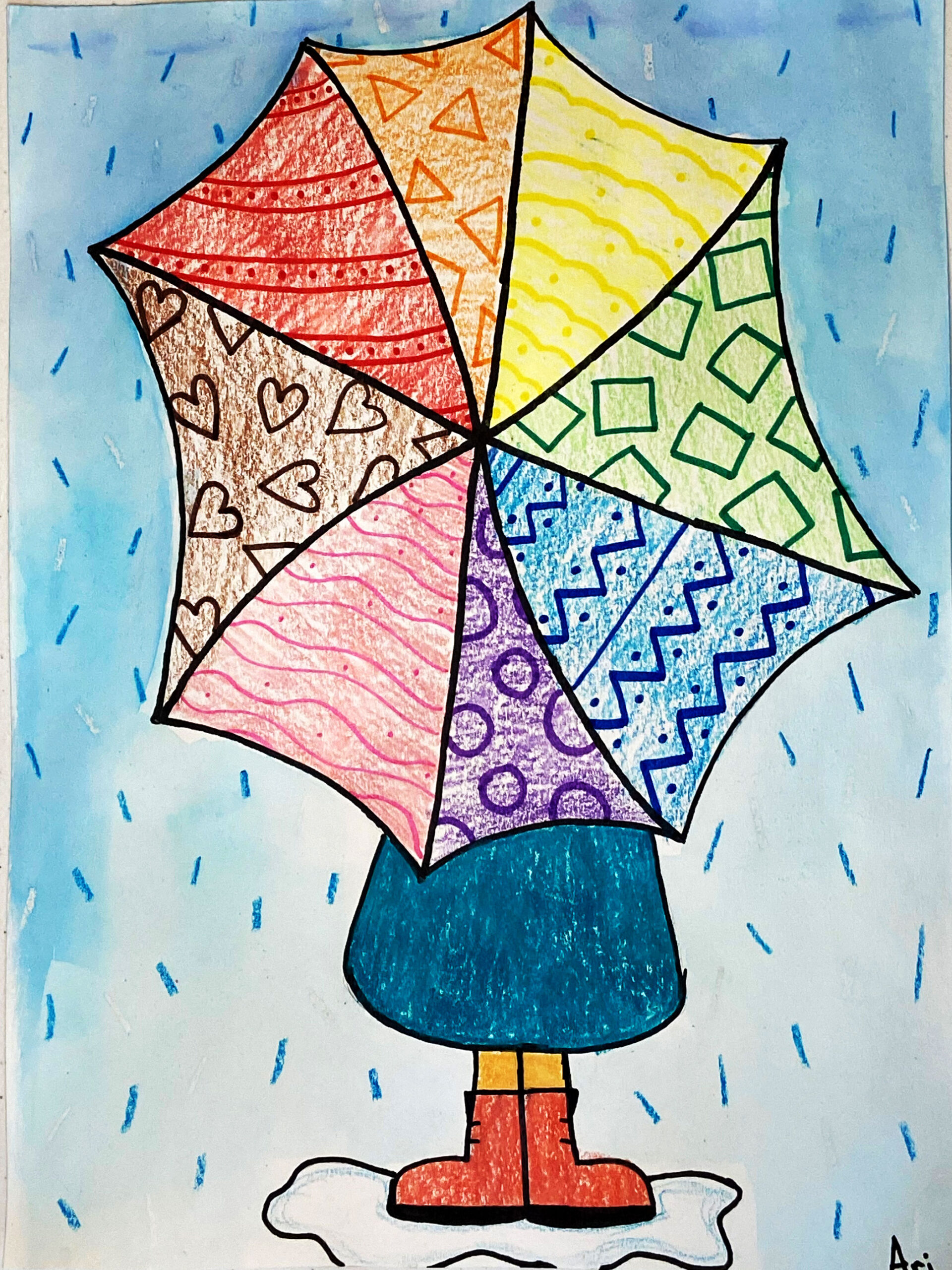 Students will use patterns and color to design an umbrella. Review how different types of lines create different patterns: loops, circles, spirals, crossed lines, teardrops, squiggles, waves, dots, or zig-zags.