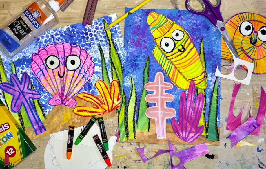 Students will cut out their painted shell, add eyes and a smile, and glue it onto their scene to complete their underwater collage. |