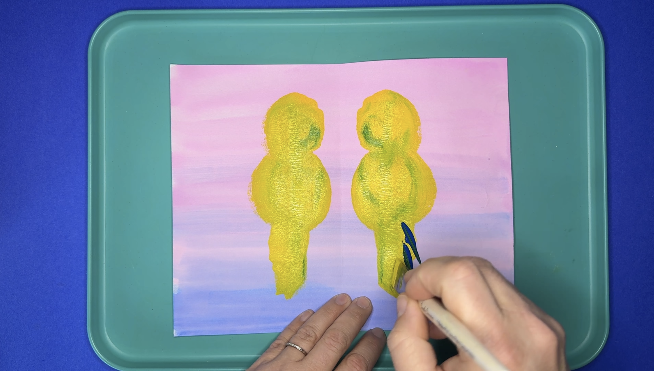Paint a bird body, head and tail on one side of the paper. Fold and print. Then let dry.