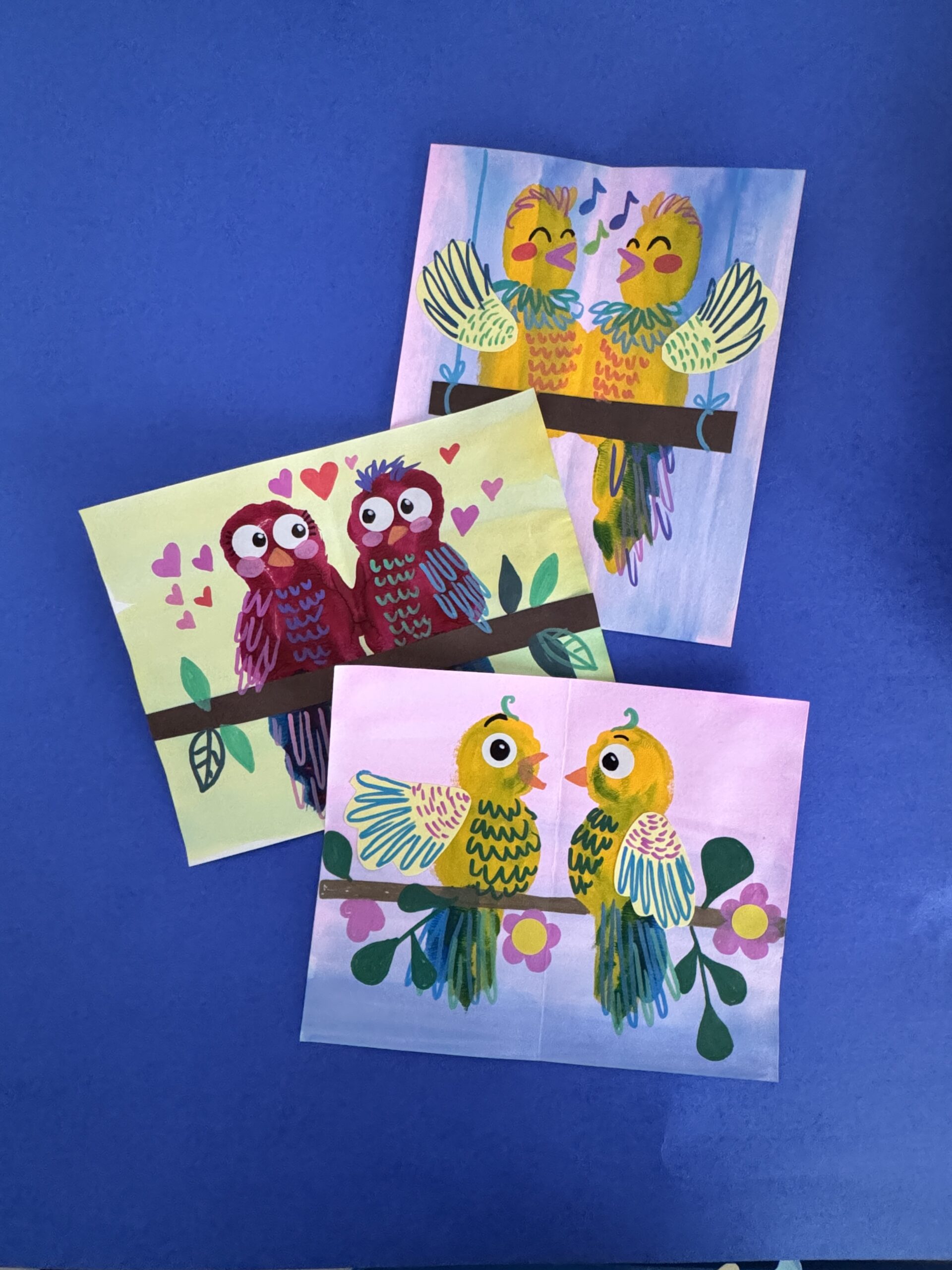 We kick off this fun process by creating a beautiful, colorful painted background, which sets a dynamic stage for the rest of our work. Once the paint is dry, the real magic begins: we use the simple yet exciting technique of monoprinting to create the textured silhouettes of two distinct birds. Finally, we bring these printed birds to life by using mixed media—combining colorful cut paper for collage, fine drawing tools, and perhaps even a touch more paint—to add intricate details, feathers, and lots of personality to our winged subjects!