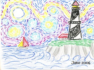 - After students draw their picture, they can trace over the lines with crayons. In the sky, use dots of yellow or white for the stars. Remember to add the moon! Use white and yellow crayons, markers or pencils to create short dash lines around the stars. Fill the spaces in between the stars with dash lines of light blue, dark blue, and purple. Try to make the sky look wavy and swirly. Leave space in between the lines for the paint.