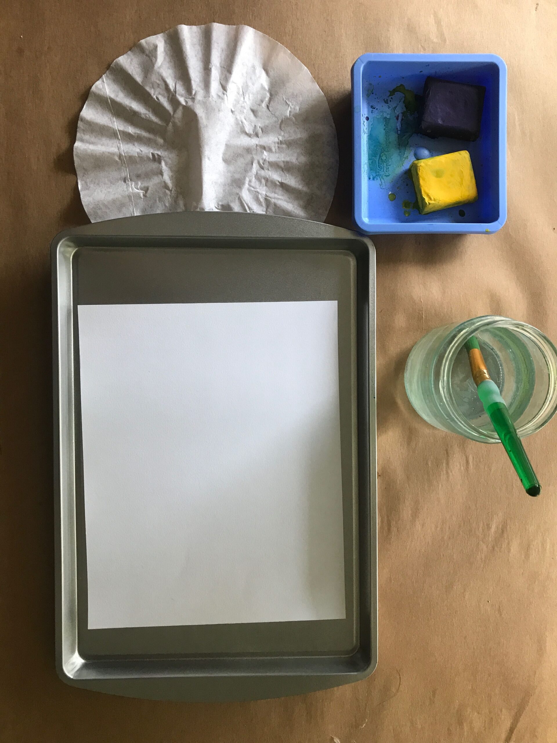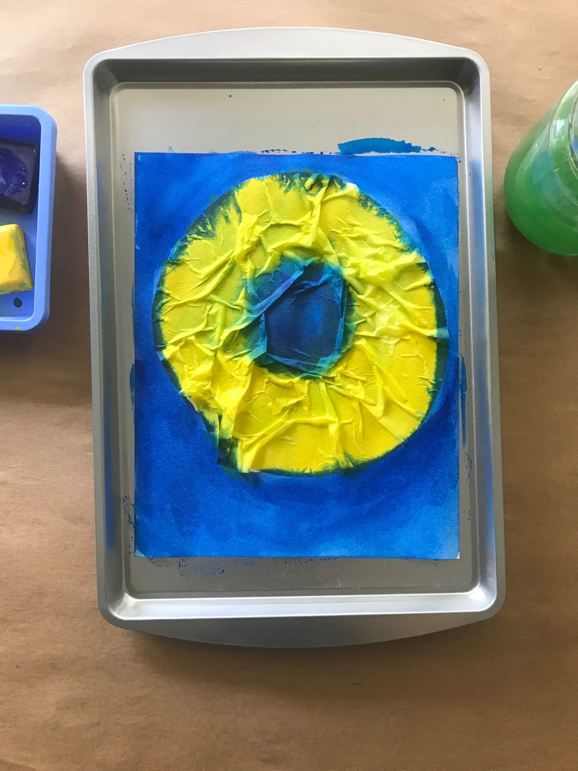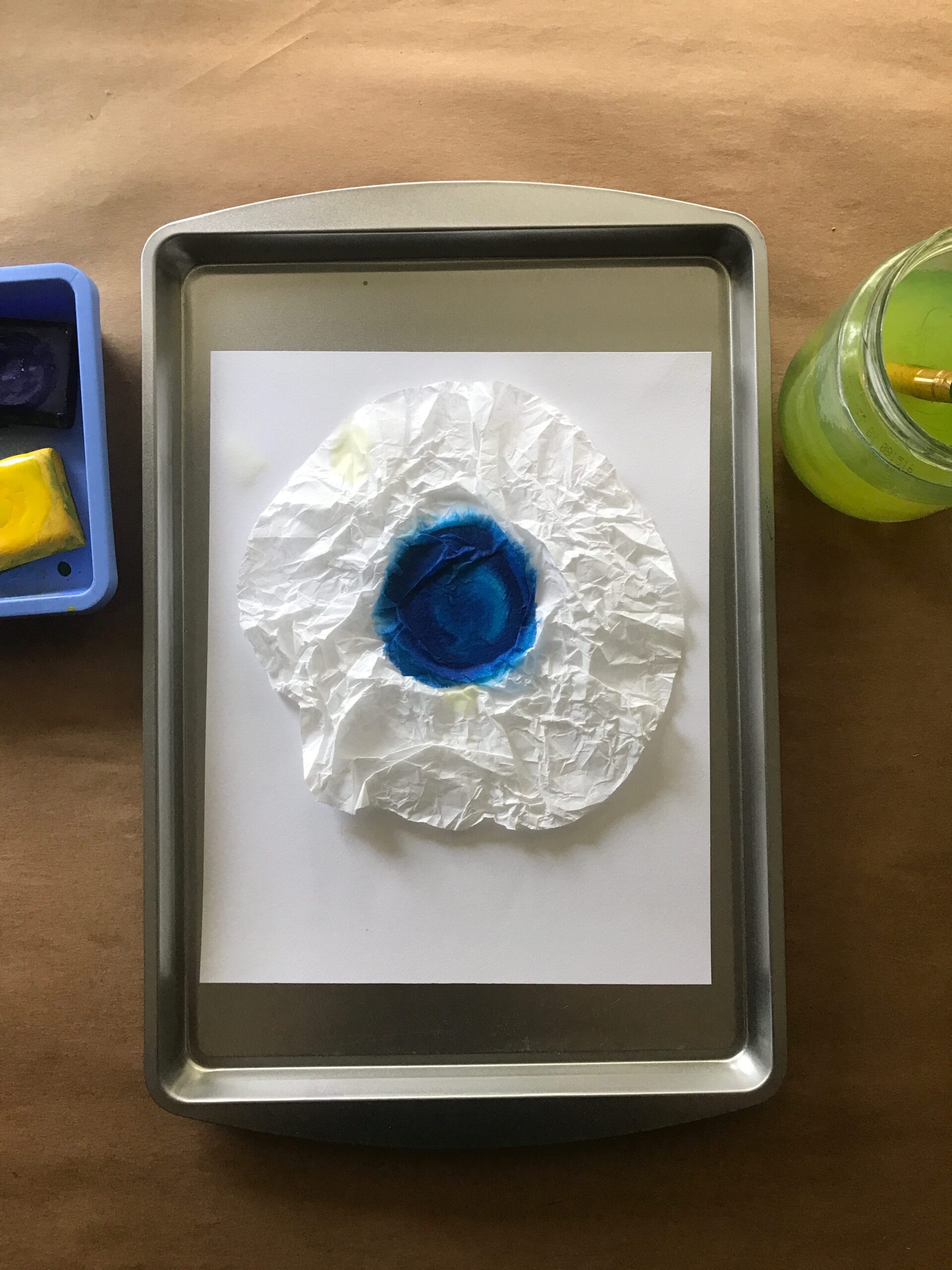 - Using yellow and blue semi moist tempera cakes, paint on top of the coffee filters creating a ring of yellow and a center of blue.