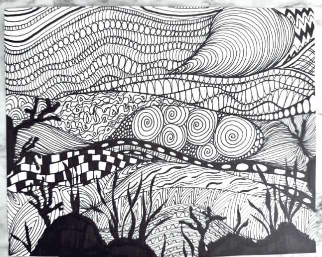 With the remainder of the paper students will draw zentangle designs in the background, which will be the ocean in their drawing. The students will draw 12 or more zentangle designs in their background. Students will be able to use their ideas from their sketchbooks and the designs shared with the class. Designs can be drawn using pencil first (optional) and traced over with black permanent marker.