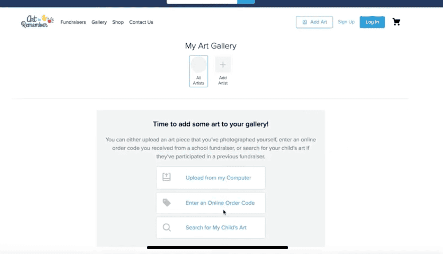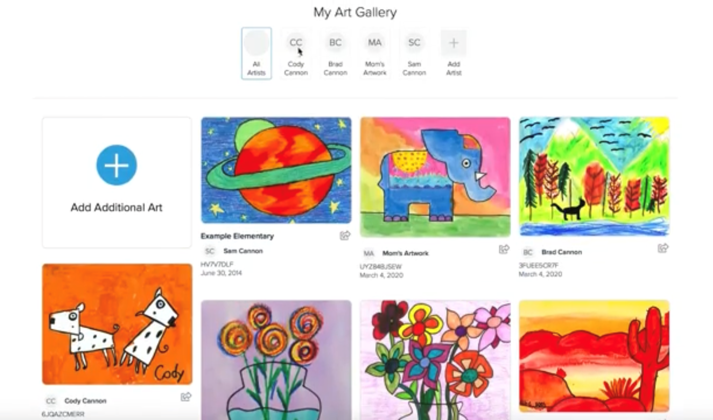 You can upload the artwork to your gallery from your phone or desktop. You can search for your child’s artwork within our online database. Many parents are happily surprised to find their child’s artwork from school stored on our database, never realizing their child’s school has worked with us.