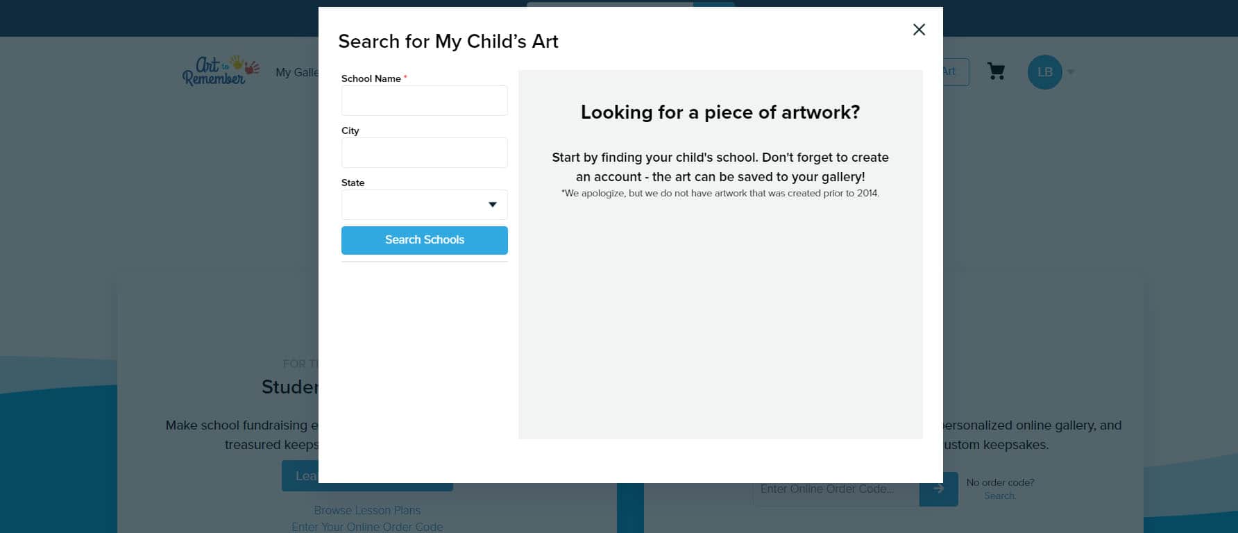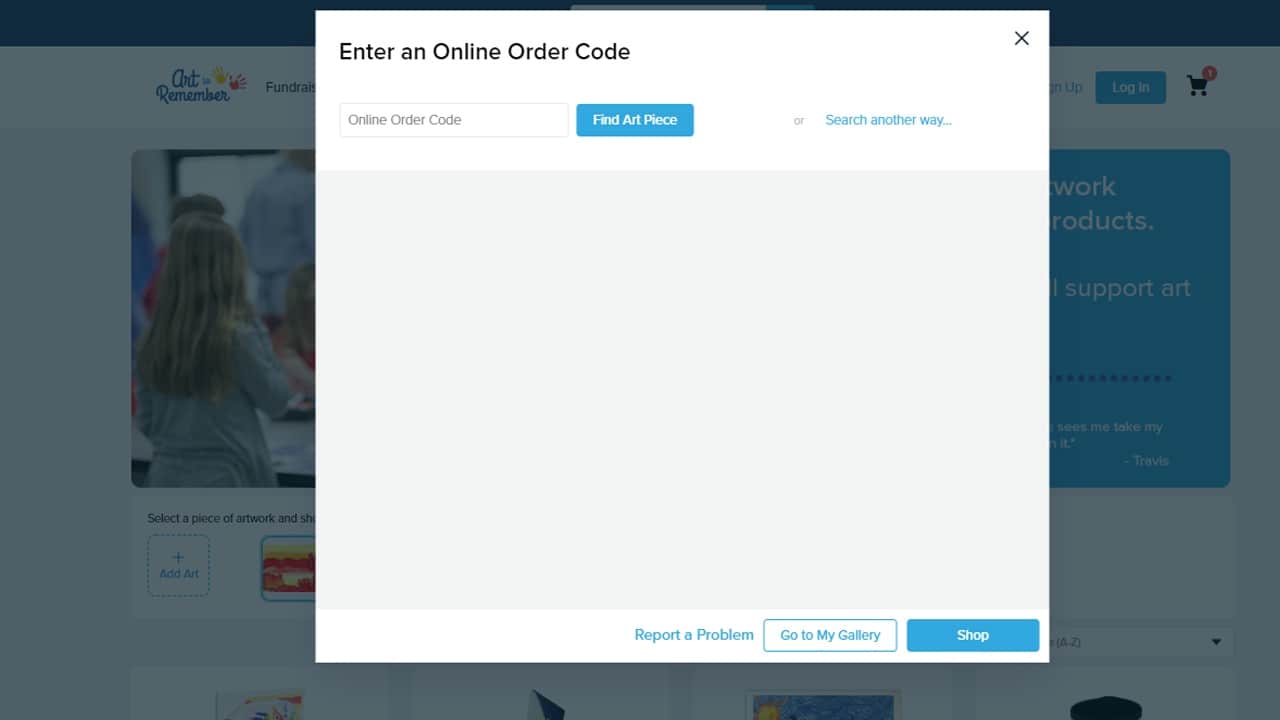 Start by going to the gallery page on your desktop. Here you will see the options to upload from your computer, enter an online order code, or search for your child’s art.
