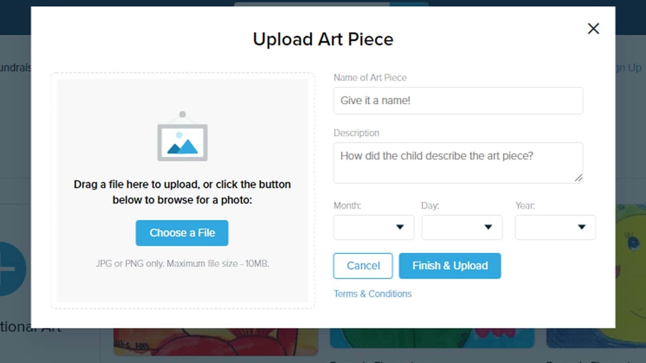 Upload Art Piece– To upload art from your computer, simply click on “Upload from My Computer”, choose a file, name the art piece, add a description and the date, and click on “Finish and Upload”
