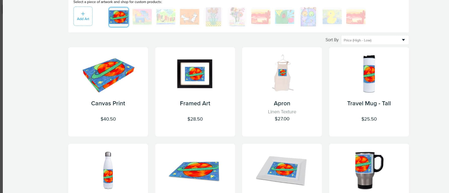 When you are shopping for keepsakes and have more than one artwork in your gallery, simply click on the artwork you would like and you can preview it on the products.
